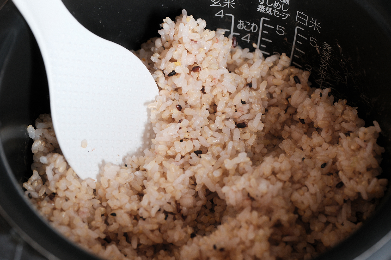もう一つ、うちが毎回やってるのが市販の雑穀ミックスを少し入れること。スーパーに売ってる、もちきびとか黒米とかハトムギとかがブレンドされたやつです。