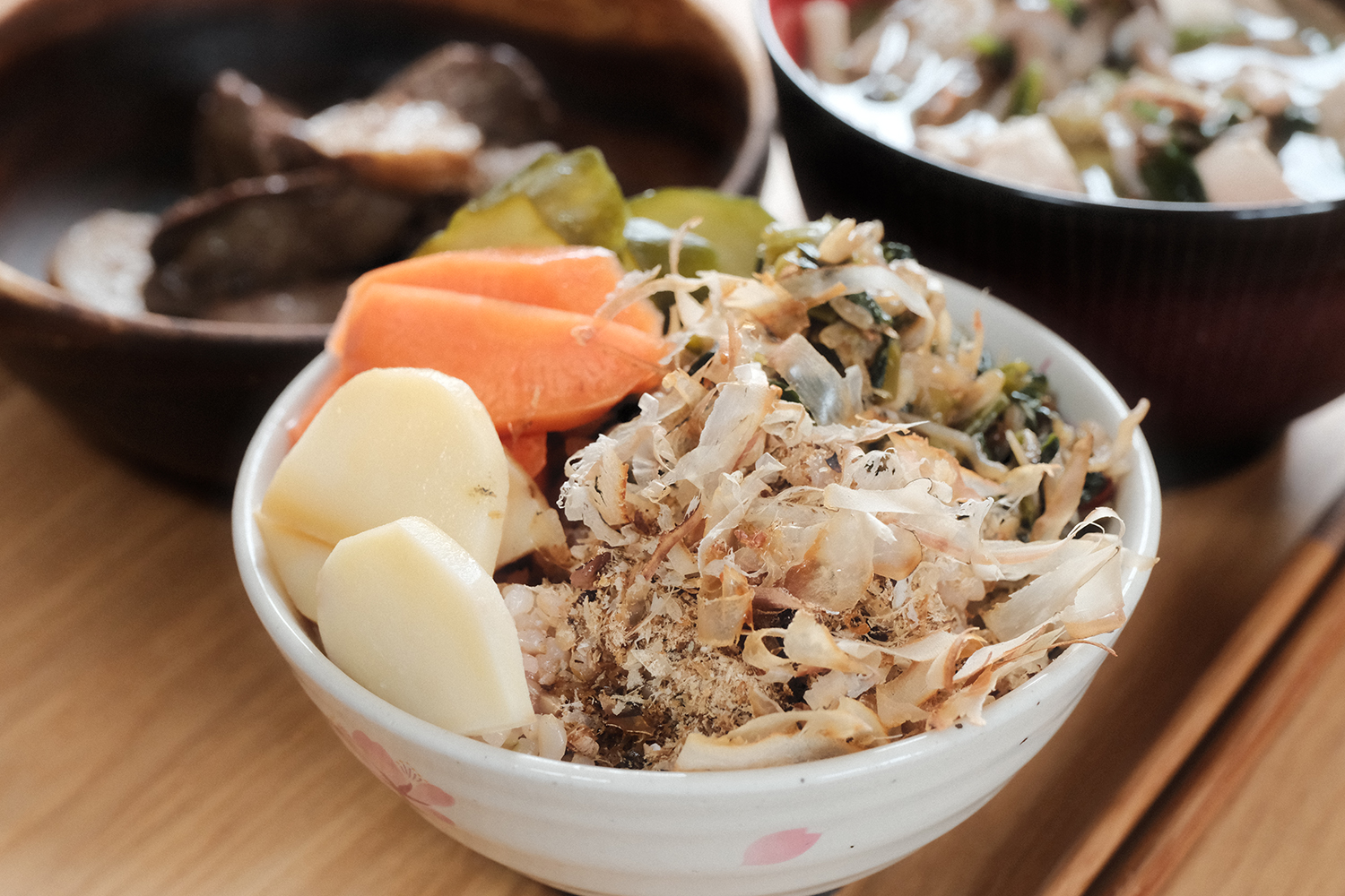 玄米ごはん(自作ふりかけ・ぬか漬け・いわしぶし)