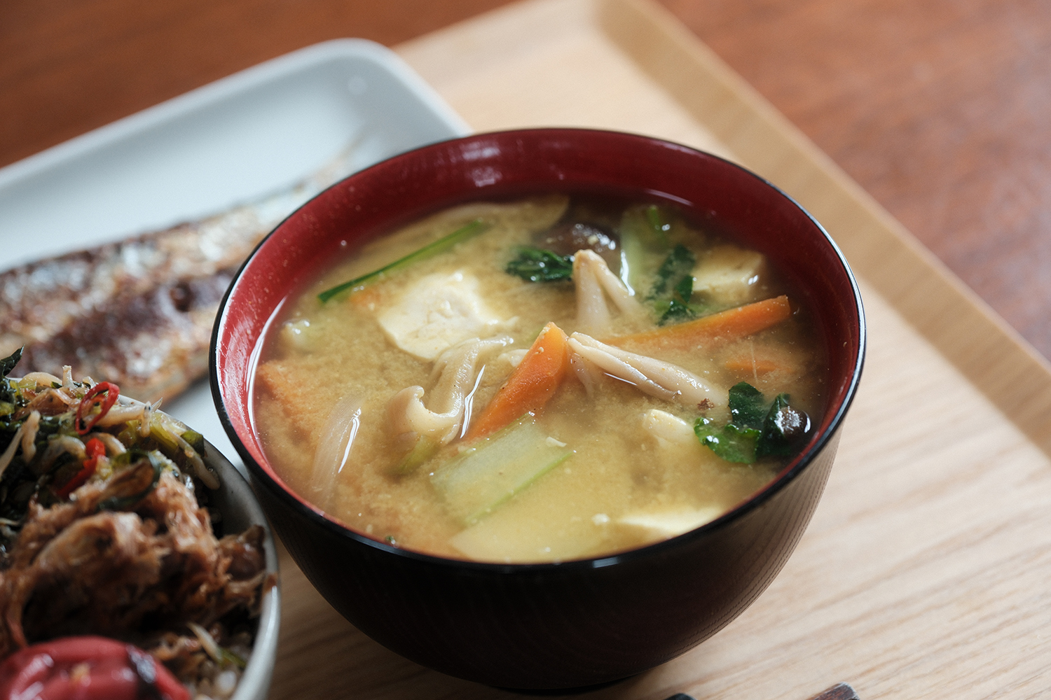 具沢山味噌汁(ほうれん草・小松菜・にんじん・じゃがいも・たまねぎ・しめじ・まいたけ・豆腐)