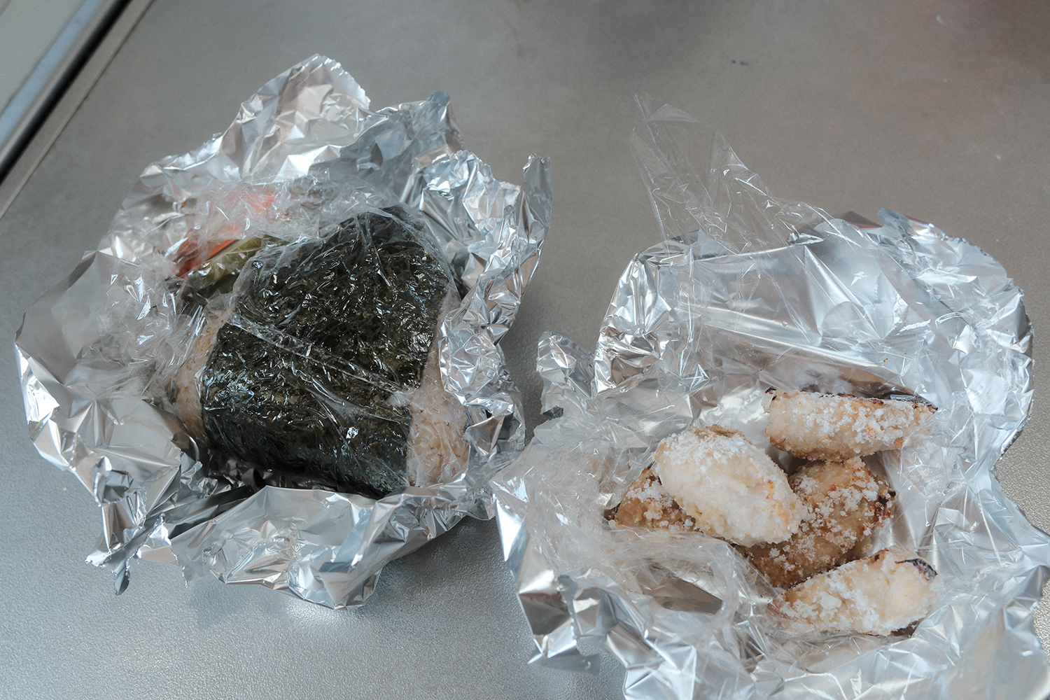 おにぎり・からあげ弁当。たまの揚げものは、やっぱりうれしい