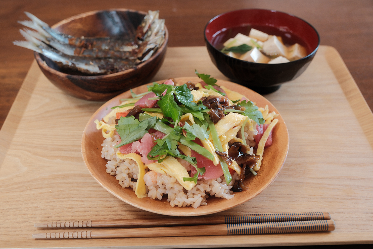 玄米ちらし寿司・おすまし・いわし。急に食べたくなって黒酢とみりんで作った